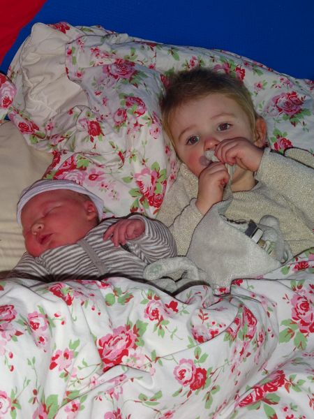 Daar is hij dan eindelijk mijn kleine broertje Naud! Vanmorgen om 06:19 geboren in het Martiniziekenhuis. Een behoorlijke poemel van 3710 gram, 400 gram zwaarder dan ik. Om 11:30 lag hij zo maar bij papa en mama in bed. Wij zijn allebei wel een beetje moe op de foto. Met mama gaat het ook goed. Zowel papa als mama hebben even een nachtje flink goed doorgehaald. Die zijn uitgeput. Daarom moet ik het grote nieuws maar vertellen!