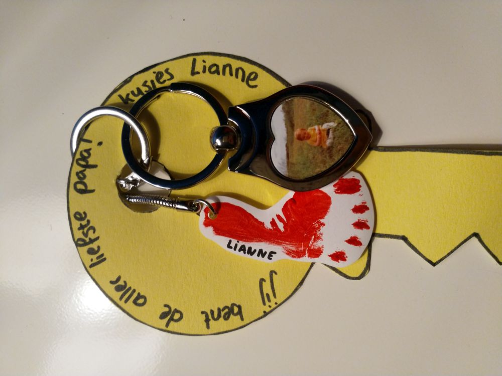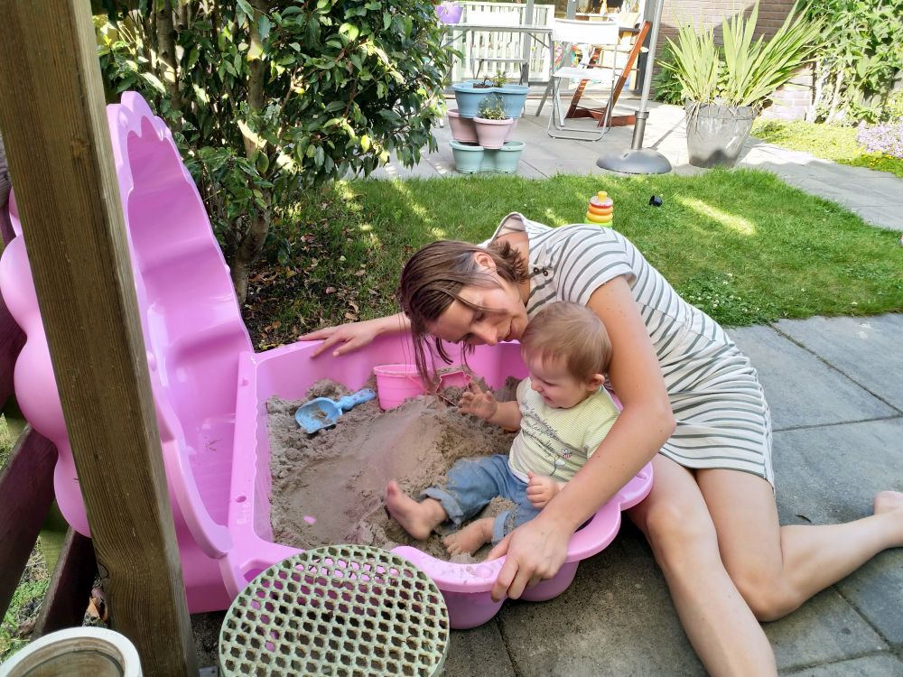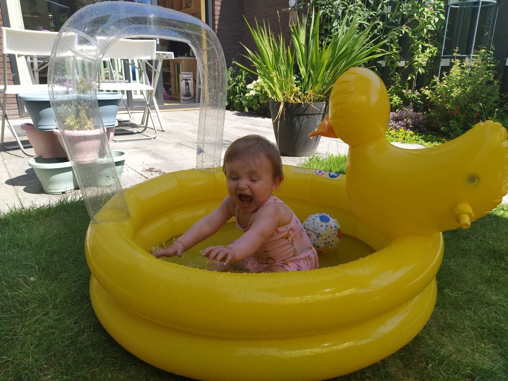 Je begint steeds meer te klauteren en te klimmen. Papa heeft alle trappen voorzien van traphekjes. Je kunt nu veilig boven op de overloop kruipen en klauteren. Je vindt de hekjes reuze interessant en je trekt je er heel handig tegen omhoog. Op zolder kan mama nu samen met jou de was doen. In deze maand is het ook vaderdag. Bij de SKSG heb je een hele mooie sleutelhanger gemaakt. Ook mama heeft samen met jou een sleutelhanger uitgezocht. Prachtig! Met zand spelen vind je erg leuk. Papa en mama hebben daarom ook een zandbak voor je gekocht. Je vermaakt je er super in en neemt af en toe een smakelijk hapje. Lekker knarsetanden. Het is een prachtige maand met veel zon en lekker warm. Het zwembadje van Marco en Claudia komt nu mooi van pas. Wat wordt je hier blij van. Je spettert papa en mama er helemaal onder.