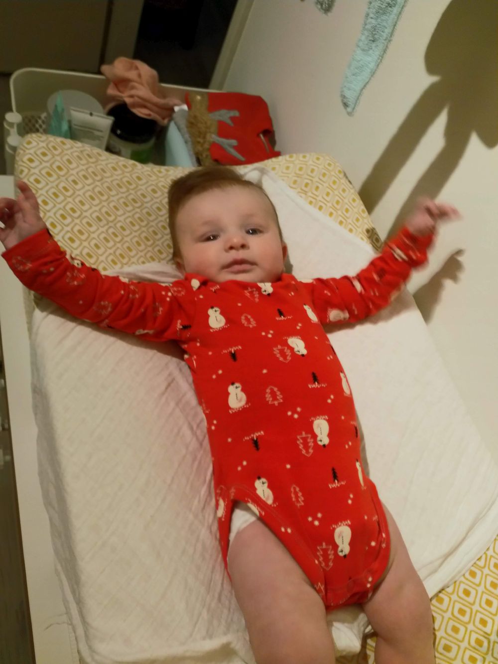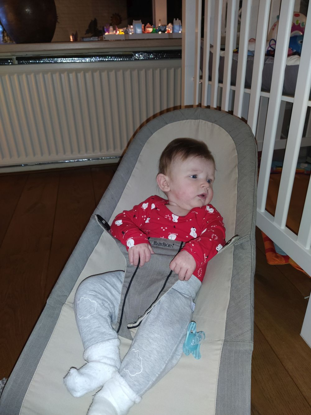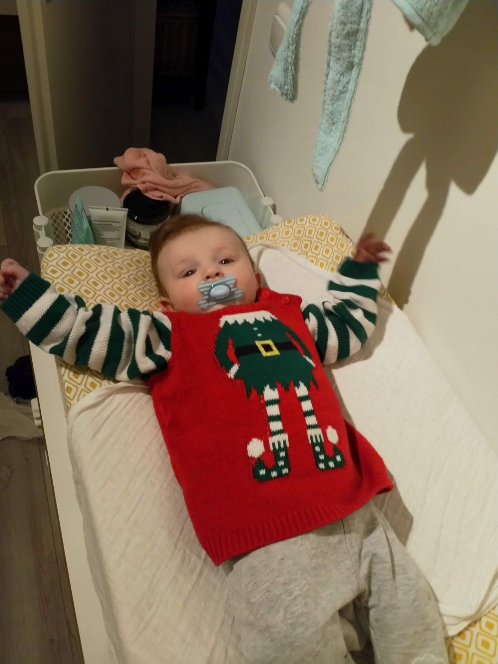 Voor het eerst kerst vieren. Je vind de kerstboom met ballen en lampjes reuze interessant. Je blijft echter op veilige afstand. Eerste Kerstdag vieren we bij opa en oma Mulder samen met oom Marco, tante Claudia en je nichtjes Fabïenne en Philou. Je hebt leuke kerstkleertjes aan. Papa krijgt op z’n werk ook een foute kersttrui en kerstrompertje.