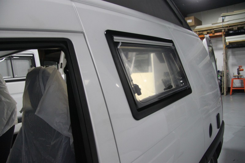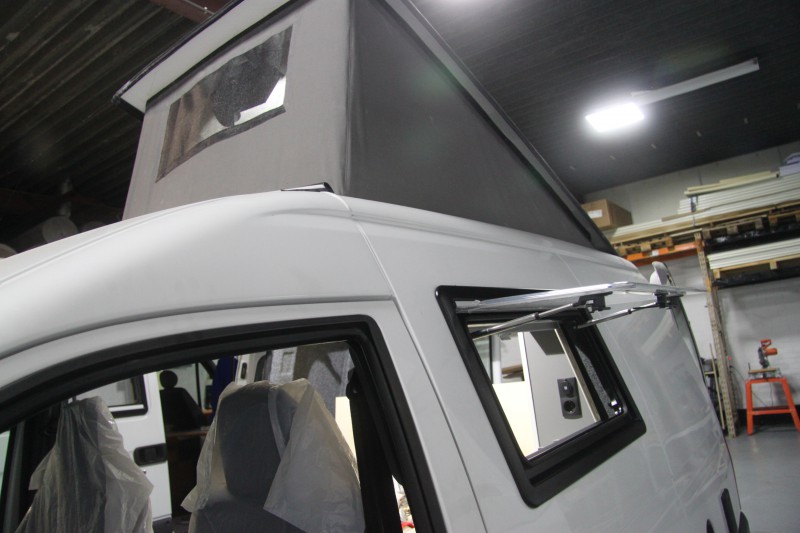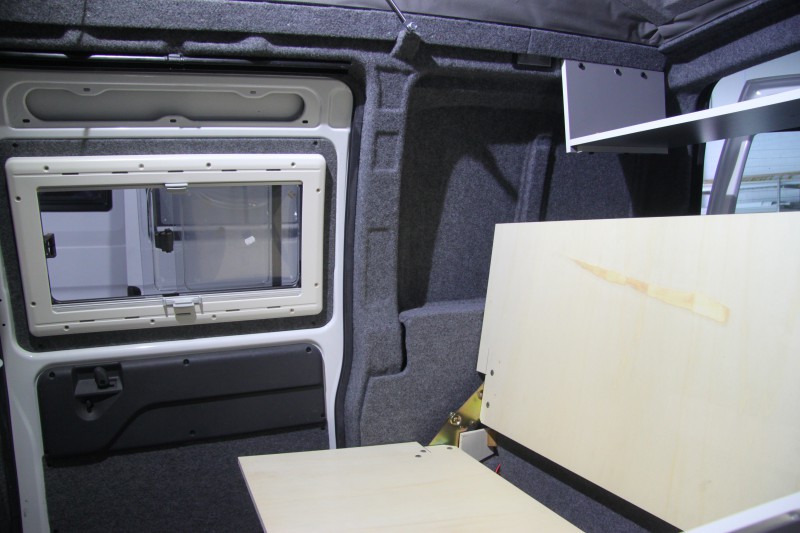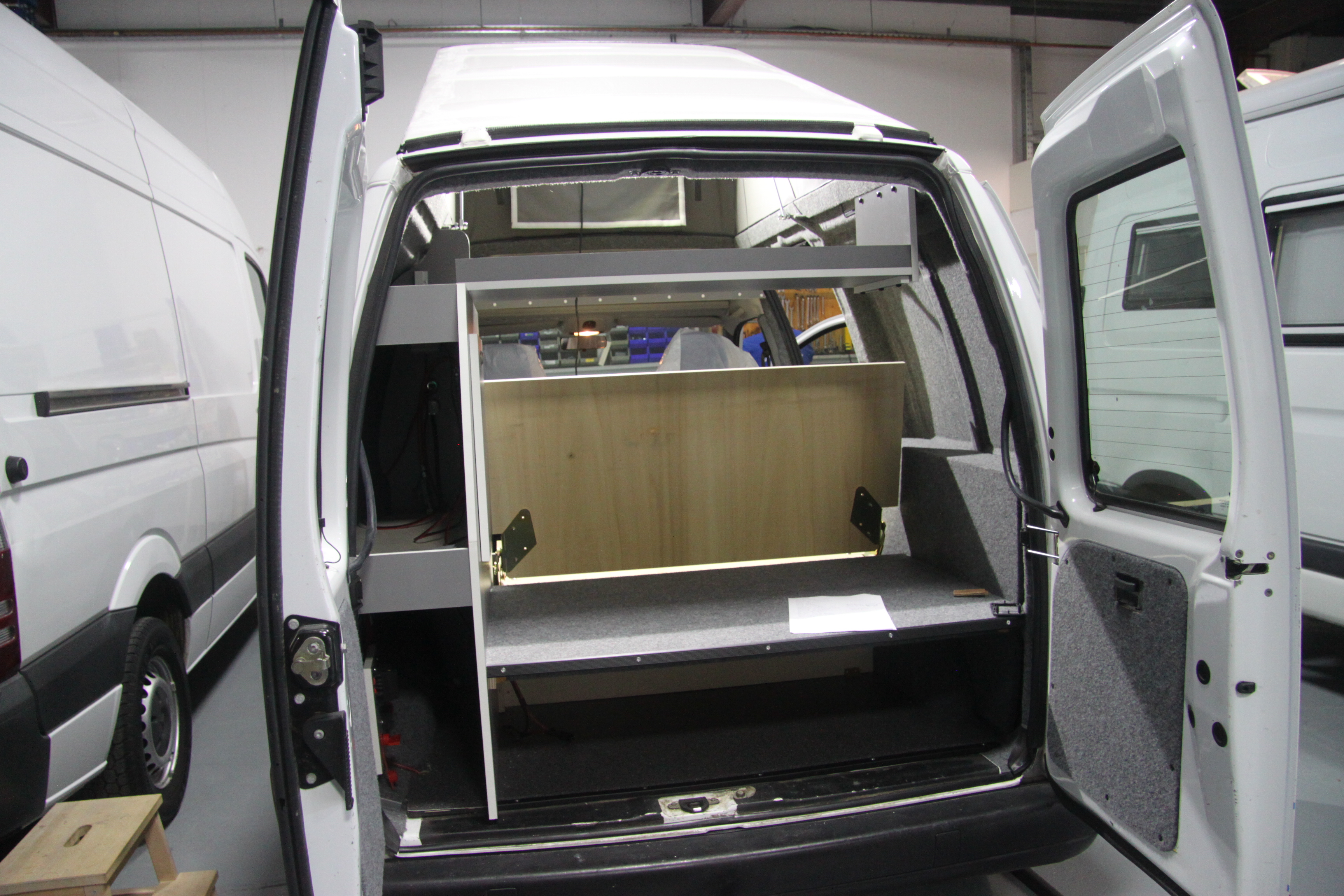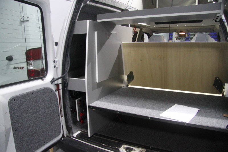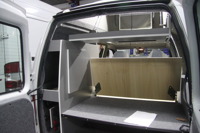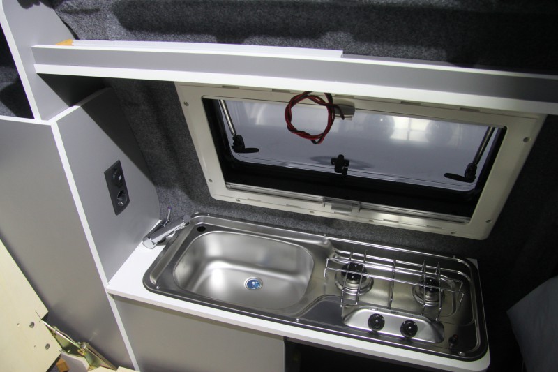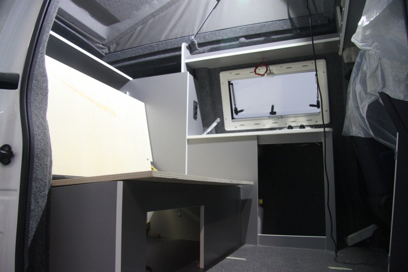 De kleurstelling, grijze meubelpanelen met een witte randafwerking, is erg mooi geworden en geeft een strak interieur. Het keukentje de kastjes en de technische onderdelen (gas, water en elektra) zijn gemonteerd en aangesloten. De ramen zijn geplaatst, de ruime kast boven de cabine geeft veel extra bergruimte, ook de plank boven het bed geeft veel extra bergruimte.