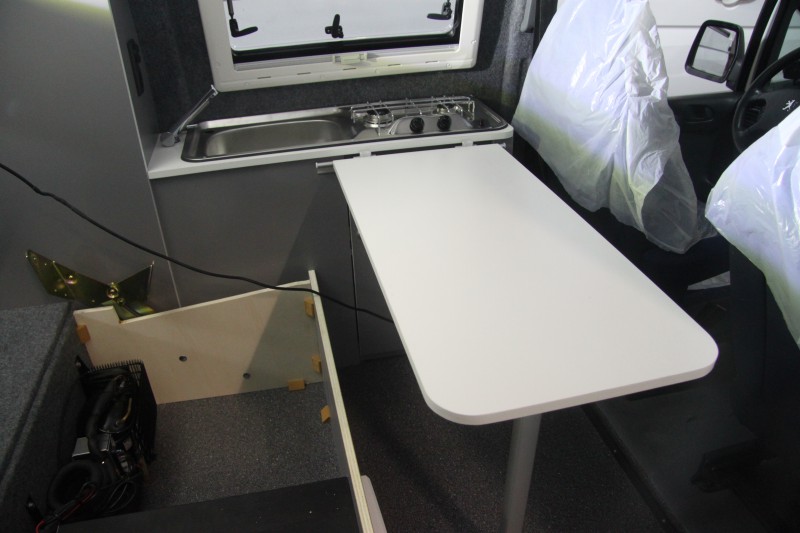 De koellade is ingebouwd en werkt. De accu is gemonteerd en ook de gasfles is geplaatst. De verlihcting heeft ook zijn plaats gevonden.