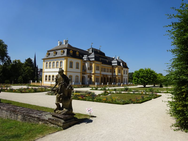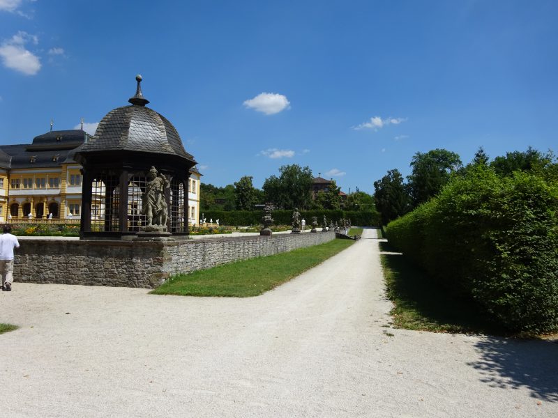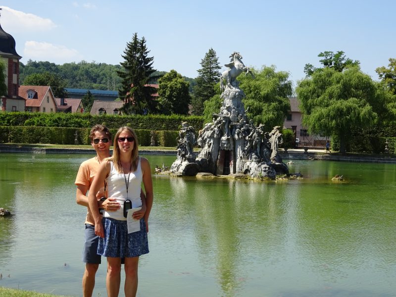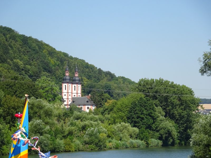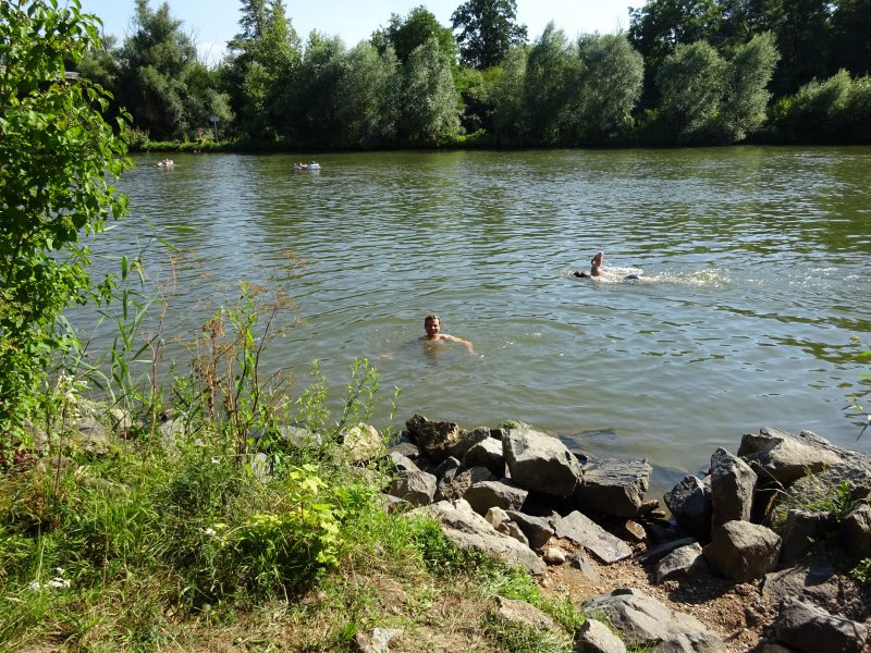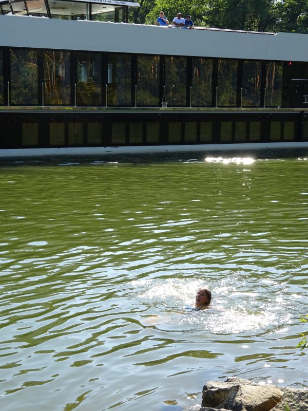 Woensdag was het nog een graadje warmer en de zon scheen al lekker toen we buiten aan het ontbijten waren. Voor vandaag stond een boottocht op de Main op het programma om de zomerresidentie en bijbehorende tuinen van de Bisschop in Veitshöchheim te bekijken. Helaas mochten er binnen geen foto’s gemaakt worden. Na het zien van het slot, zijn we nog even wezen zwemmen in de Main.