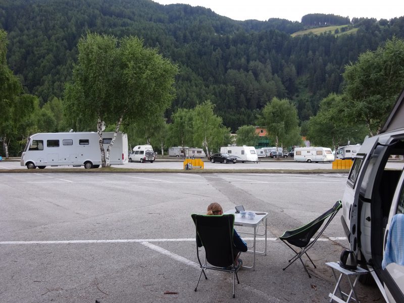 Vrijdag ging de wekker om 07:00 uur en na het ontbijt hebben we de tent ingepakt om onze reis richting Italië te vervolgen. Rond 14:00 uur hebben we de Oostenrijkse grens bereikt en getankt. Via de Brennerpas zijn we rond 16:30 de Italiaanse grens gepasseerd, eerder dan verwacht waardoor de tussenstop dus in Italië was. Een grote camperplaats bij een parkeerplaats voor truckers. Van alle gemakken voorzien.