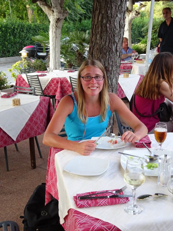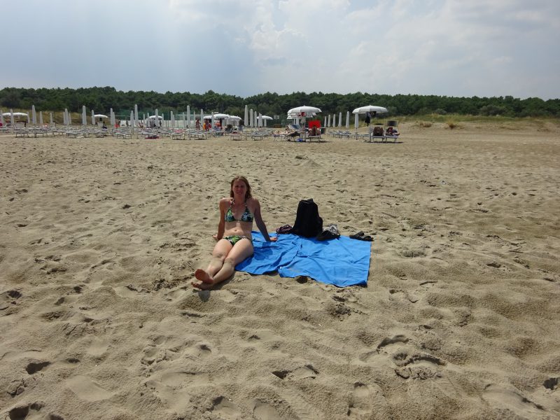 Vandaag hebben we de hele dag op het strand gelegen. Genieten van de zon en de zee. Esther kreeg een mooie vlecht in haar haar. In de namiddag zijn we op de fiets gestapt om de winkels te bekijken in Marina di Ravenna. Daar hebben we ook een hapje gegeten bij Pilar. Esther dacht dat ze pasta besteld had, echter bleek het een heerlijke steak te zijn. Het voorafje van mozzarella met ham viel ook erg in de smaak. Ricardo had de scherpste pizza besteld. Uiteraard hebben we ’s avonds nog even een drankje gedaan ter ere van Fabienne’s derde verjaardag!