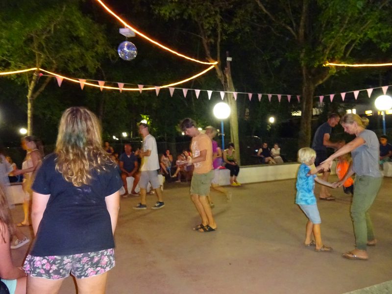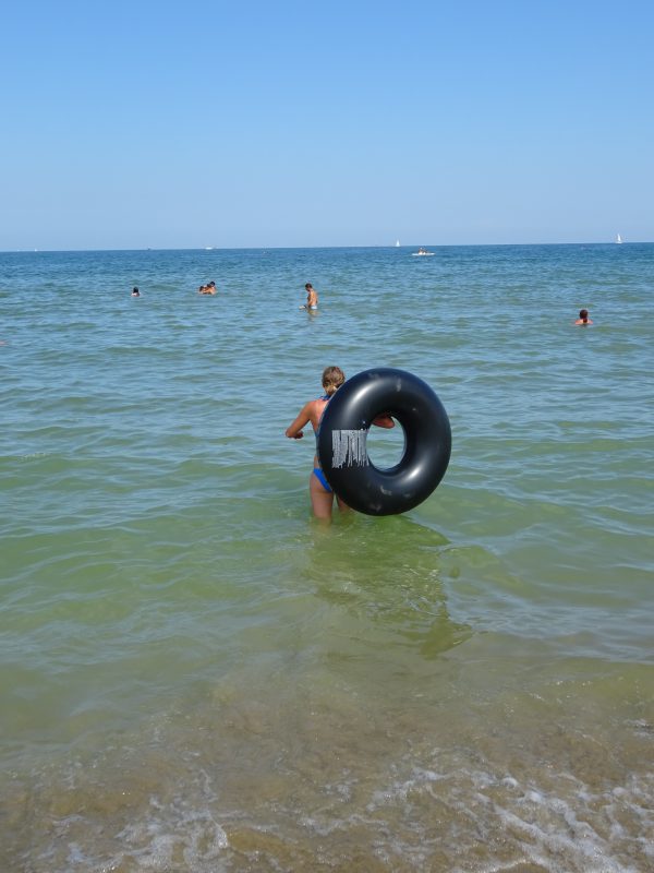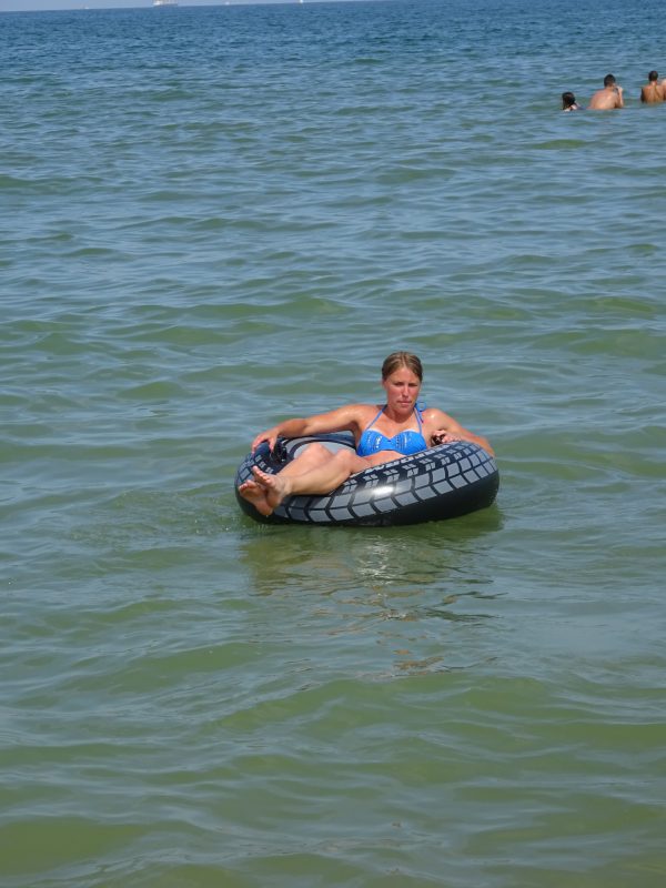 Donderdag was het weer warm, ter verkoeling en om de verbrande huid te sparen hebben we eerst een wandeling van 12 km door het oude bos achter de camping gemaakt. Daarna zijn we nog even op de fiets gestapt om een stukje te fietsen. In de loop van de middag hebben we een opblaasbare band gekocht om lekker te kunnen dobberen in de zee. ’s Avonds hebben we zelfs nog even gedanst!
