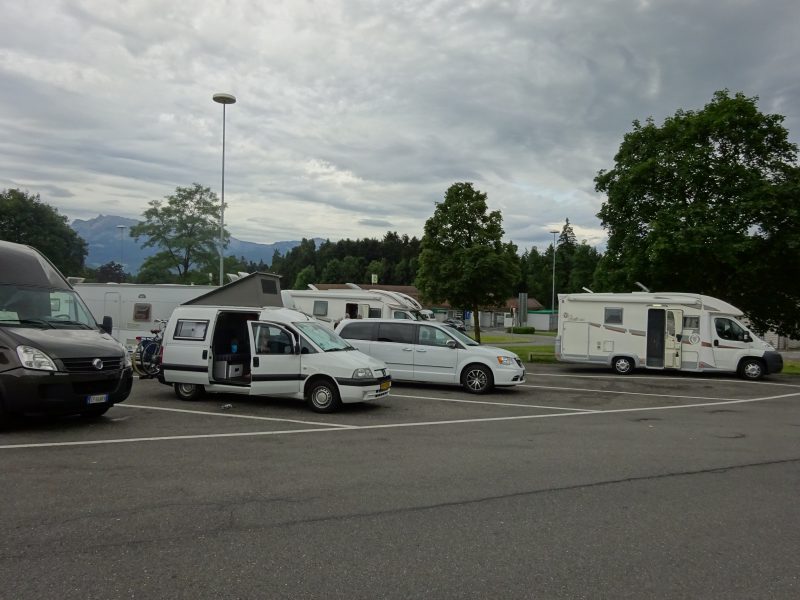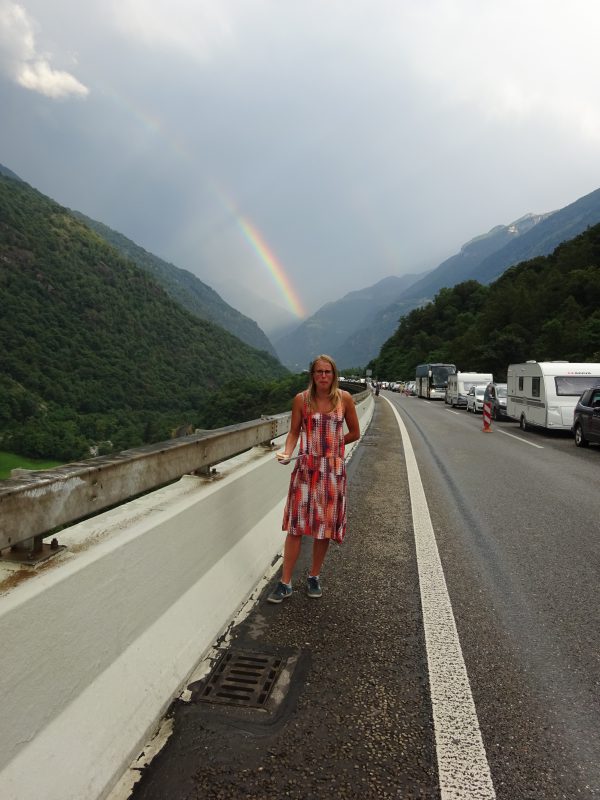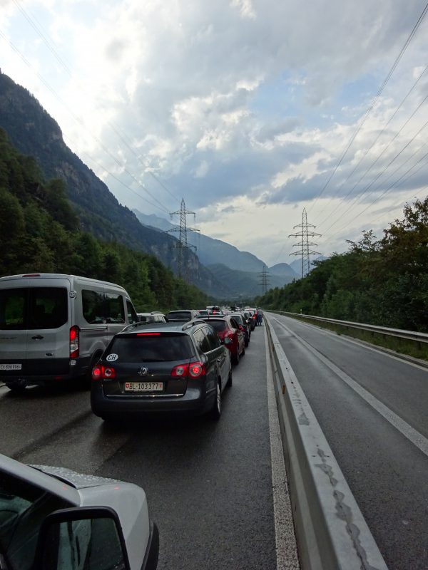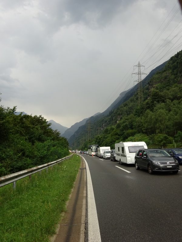 Zaterdag ging de wekker weer vroeg. De tent ingepakt en de reis richting Attert, België gestart. De tussenstop was in Zwitserland gepland een route van ongeveer 6 uur. Helaas bleek de realiteit iets anders te zijn. Uiteindelijk heeft de trip 12 uur in beslag genomen. Rond half 10 zijn we vertrokken vanaf de camping en kwamen niet ver buiten Ravenna in de file te staan vanwege een ongeluk. na deze file was de weg richting Zwitserland redelijk te doen zonder veel oponthoud. Bij een grote Autogrill geluncht, heerlijke pasta! In Zwitserland als eerste een flinke onweersbui met bijbehorende regen en hagel op ons dak gehad, daarna begon de fileleed pas echt…! Voor de Gottardtunnel was het druk en hebben we uiteindelijk een kleine 3 uur moeten wachten. Rond 21:00 uur geprobeerd een camping op te zoeken, helaas bleken deze allemaal vol. Wij zijn uiteindelijk maar gestopt op een grote parkeerplaats waar meerdere caravans en campers hun toevlucht hadden gezocht.