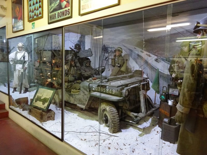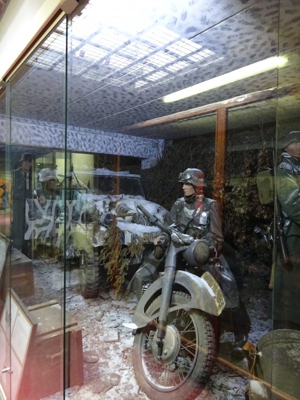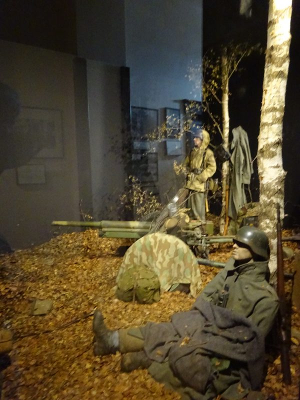 De volgende dag kwam de regen met bakken uit de hemel. De fietstocht richting Bastenaken (Bastogne) leek ons ook geen goed plan. Voor het eerst hebben we de tent maar losgekoppeld van de auto en zijn richting Bastenaken gereden om daar enkele musea te bezoeken. Als eerste stond het Bastogne Ardennes 44 museum op het programma. Deze bleek gesloten. Toen zijn we verder gereden naar het Bastogne War Museum. Waar ook het Mémorial du Mardasson staat. Het was druk, maar zeker de moeite waard voor een bezoek. Wat hebben ze het zwaar gehad in de Ardennen tijdens de oorlog. Alle dropen rond en Bastenaken zelf zijn zwaar verwoest tijdens de bevrijding.