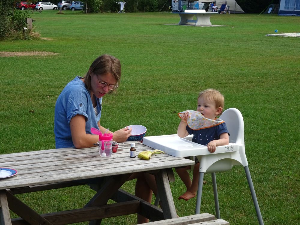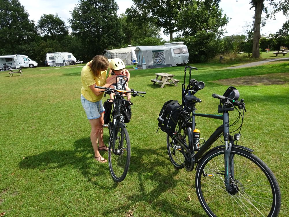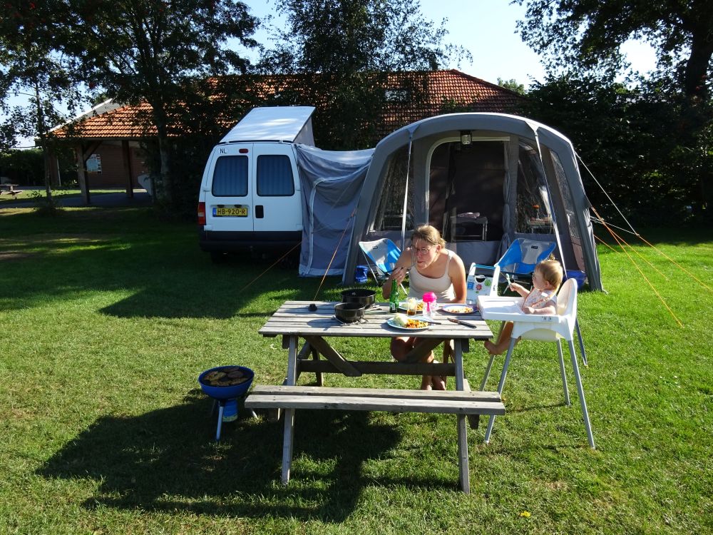Voor ons was het ook weer even wennen. De nieuwe tent is in ieder geval veel minder tochtig en voorzien van horren. Helaas bleken deze de muggen niet helemaal tegen te houden. Lianne werd midden in de nacht ook wakker en heeft tussen ons in gelegen. De volgende morgen was het even schrikken. Het leek wel of Lianne spontaan waterpokken had gekregen op haar gezicht. De muggen vonden haar bloed toch lekkerder dan het onze. Na het ontbijt en het slaapje van Lianne zijn we naar de binnenspeeltuin gegaan. Lekker klauteren en met de trekkers spelen. Daarna broodje gegeten bij de tent en was het tijd voor het middagslaapje van Lianne. Na haar slaapje hebben we nog een leuke route gefietst (Doldersum, Wateren, Zorgvlied) en bij Eethuis Cafetaria Zorgvlied en lekker ijsje gegeten. Wat een prachtige omgeving. Op de camping hebben we macaroni gemaakt en na het eten de geitjes gevoerd met wat brood dat wij over hadden. Uiteraard moest er ook nog even geschommeld en gesprongen worden op het springkussen. Voor de nacht hebben we alles goed ingespoten met anti-mug. Het bleek deels te werken. Lianne viel snel in slaap na alle indrukken van vandaag. Wij hebben nog heerlijk voor de tent Rummikub gespeeld.