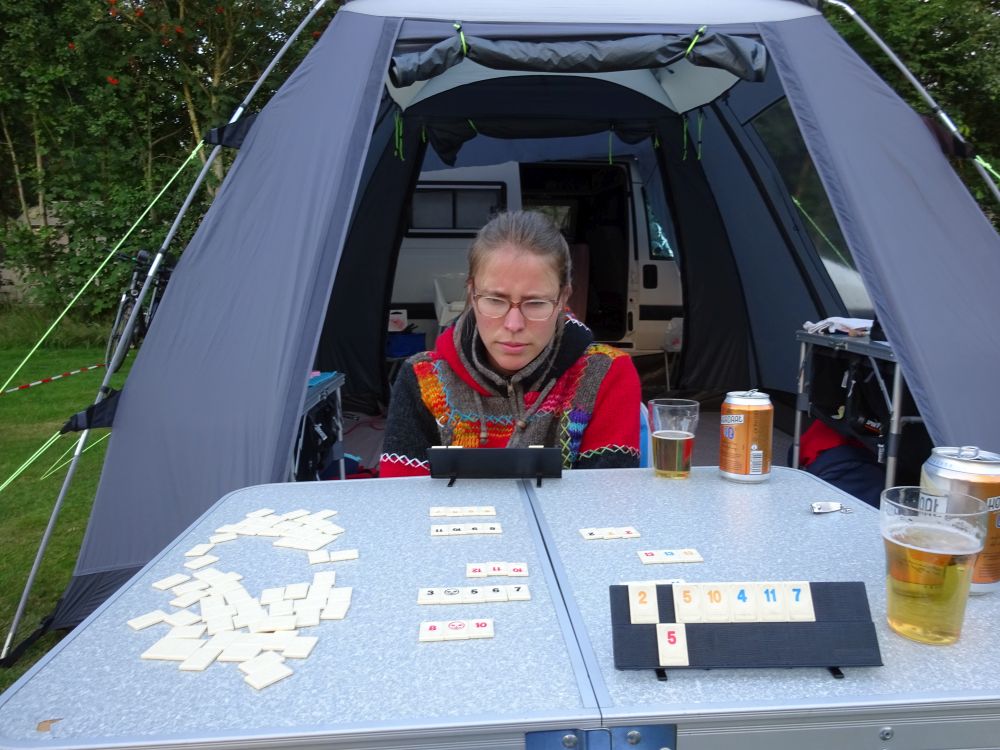 Na het spelen de buggy gepakt en richting Twijzelerheide gelopen. Volgens Google zou de warme bakker open zijn. De warme bakker dacht daar zelf anders over. Wegens vakantie gesloten. Dat is balen. Bij Snackbar ’t West maar een lekker ijsje gegeten. Het werd weer tijd om terug te lopen naar de camping. De maagjes begonnen te knorren. Lekker eenvoudig een maaltijd salade met stokbrood en smeersels. Lianne een lekker potje. Na het eten nog even spelen en bij de hertjes gekeken. Esther heeft Lianne daarna “afgewassen”. Het duurde even voordat Lianne in slaap viel. Wij hebben de hele avond nog lekker buiten gezeten met Rummikub.