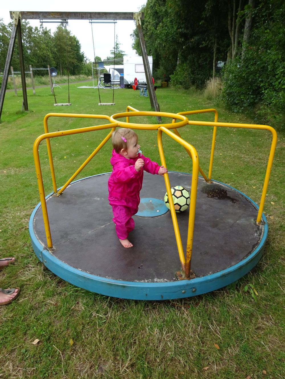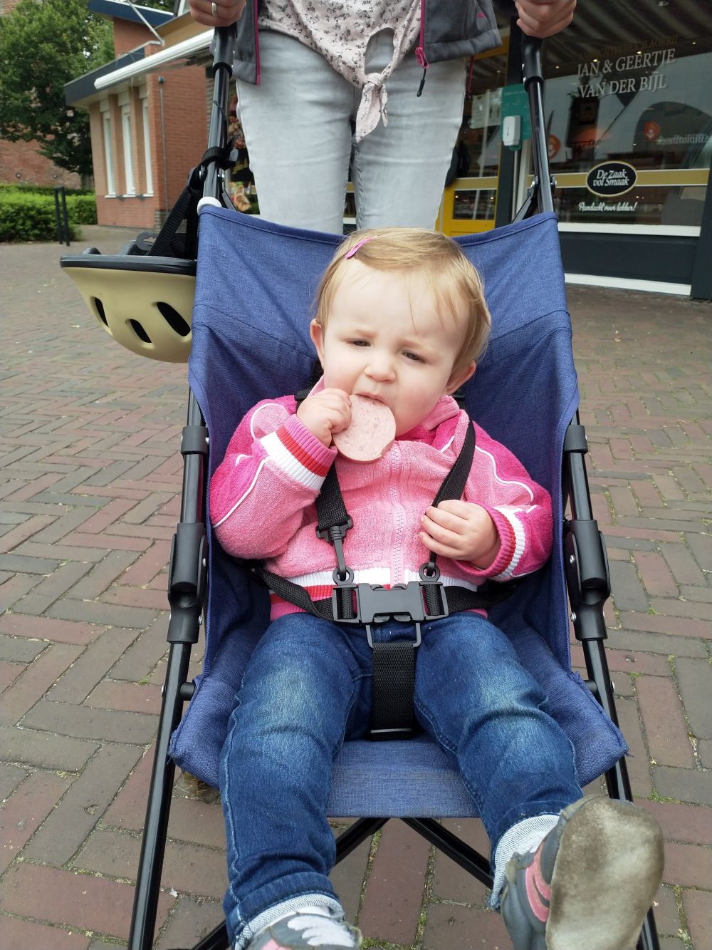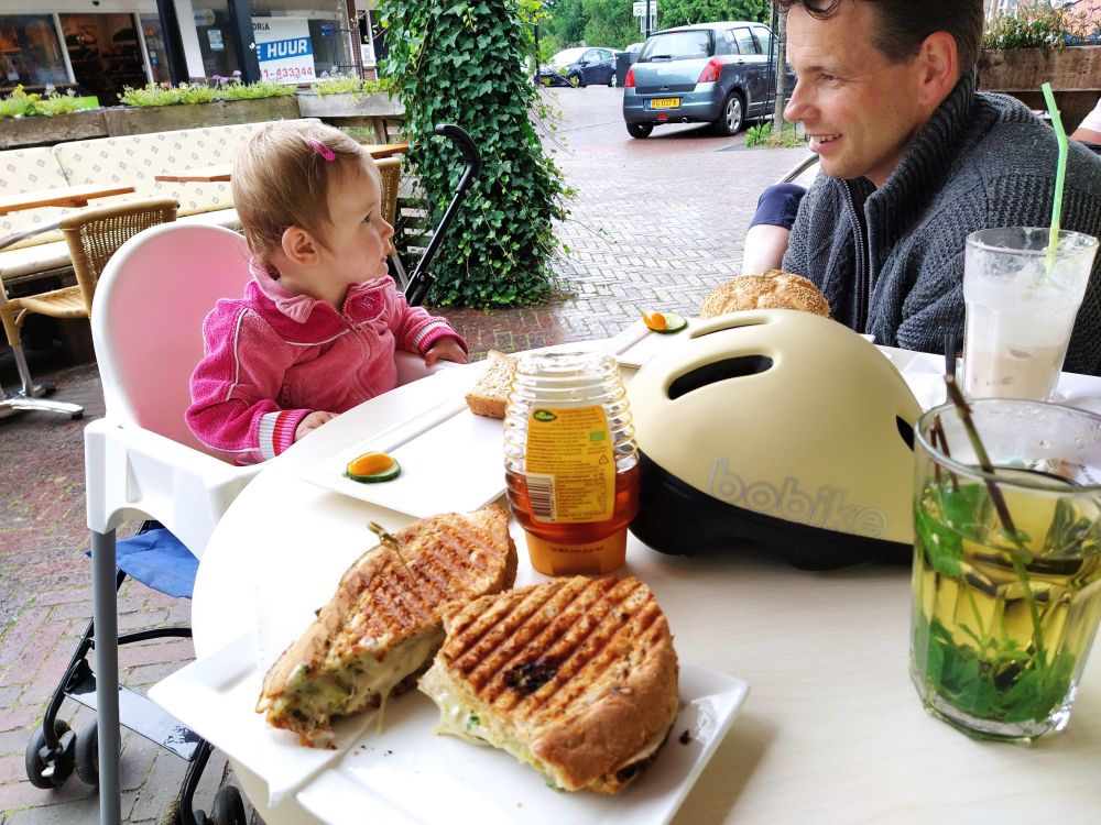 Lianne werd rond 04:00 alweer wakker. Gelukkig viel ze uiteindelijk wel weer in slaap om vervolgens om 6 uur wel klaarwakker te worden. Het dagelijkse ritme. Lekker vroeg ontbeten. Het was zwaar bewolkt, maar wel droog. Lianne haar regenpak aangedaan en die ging lekker buiten spelen op het gras. Wat zou het weer gaan doen vandaag, de grote vraag. We hadden wel een fietsroute uitgestippeld. Na Lianne haar slaapje besloten om gewoon naar Buitenpost te fietsen. Onderweg begon het al een beetje te miezeren, maar we kwamen droog aan. Ook in Buitenpost was het vakantie. Het was rustig in het dorp. Bij Binnen Markt Buitenpost hebben we een heerlijk broodje gegeten. Lianne heeft haar eigen broodje helemaal opgegeten en ze vond de muntthee van Esther ook best lekker. De ijskoffie vond ze ook wel te pruimen. Bij de slager hebben we nog wat lekkers gekocht voor die avond. Lianne kreeg een plakje worst. Dat was reuze interessant. Ze heeft hem ook grotendeels opgegeten. Nog even langs de bakker en de boekenwinkel toen was het weer tijd om terug te gaan naar de camping. ’s Middags hebben we grotendeels doorgebracht in de speeltuin. Er kwam zelfs nog een ijscofiets op de camping!