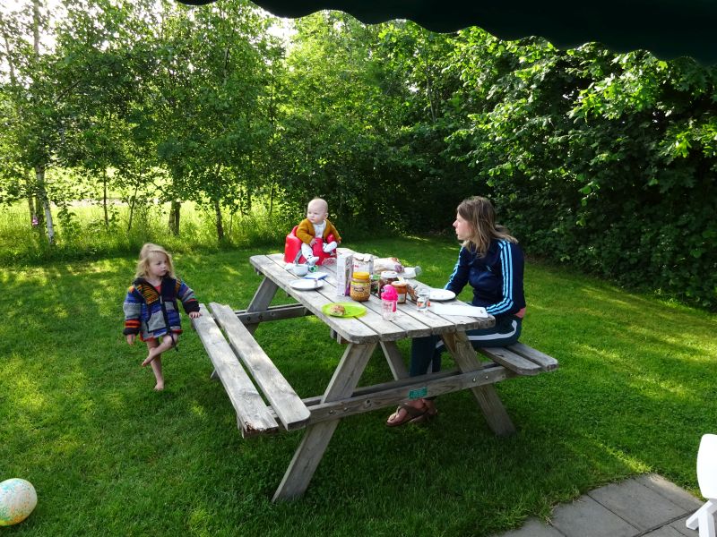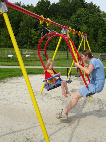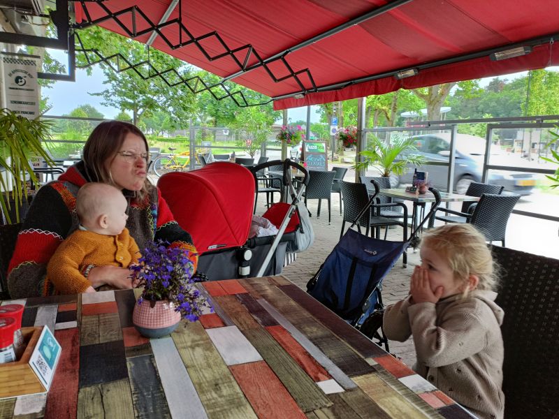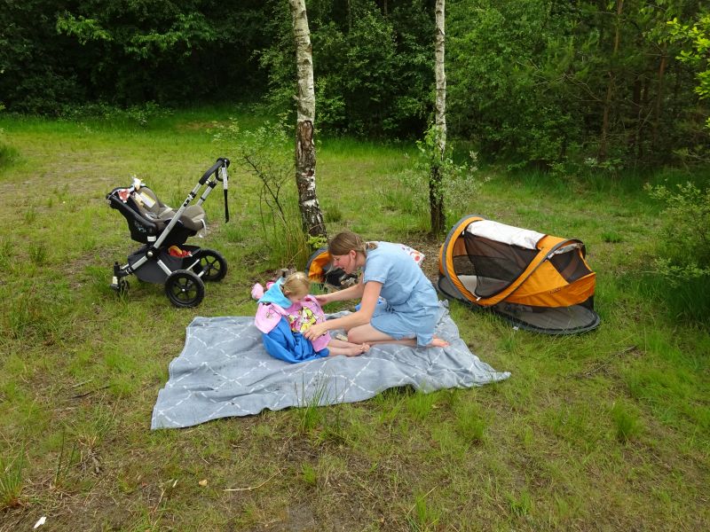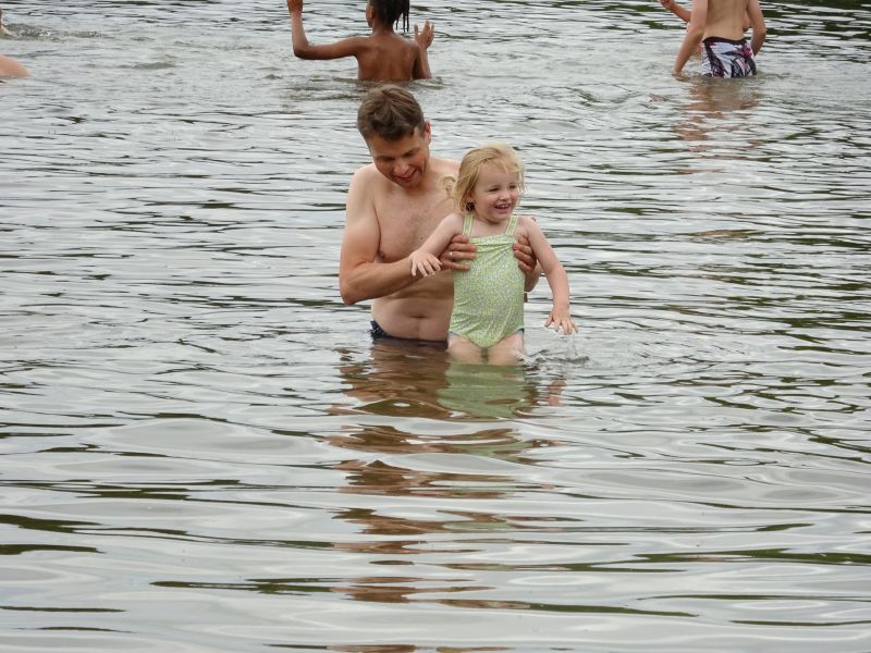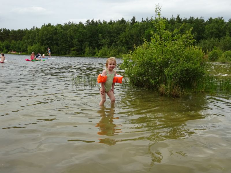 De volgende ochtend buiten ontbijten en daarna hebben we boodschappen gedaan in Appelscha. Het zou vandaag ook weer warm worden. Zwemmen! Bij het Canandameer (Aekingermeer) hebben we ’s middags even lekker een verfrissende duik gedaan. Mama en Naud bleven veilig op het strand. Papa en Lianne hebben even lekker geplonsd. Lianne heeft zelfs een kikker vastgehouden. Tijdens het zwemmen werd het donkerder in de lucht en begon het zelfs een beetje te regenen. Voor ons reden genoeg om weer terug te gaan naar de camping. Om even binnen te spelen. Het werd steeds killer en hebben die avond gewoon binnen gegeten en nog even gespeeld in de speeltuin. In de nacht zou het nog flink gaan regenen waar iedereen wakker van werd.