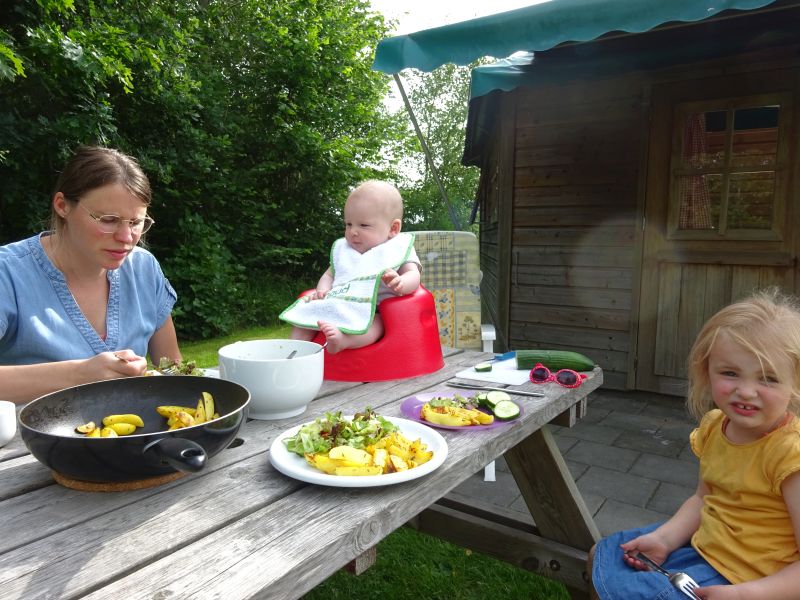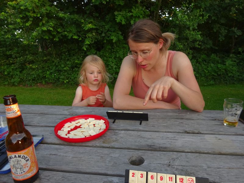 ’s Avonds lekker buiten kunnen eten. Salade met gebakken aardappelen. Beide kids moesten een beetje wennen qua slapen. Lianne heeft ons laat in de avond nog even meegeholpen met Rummikub.