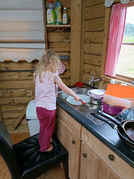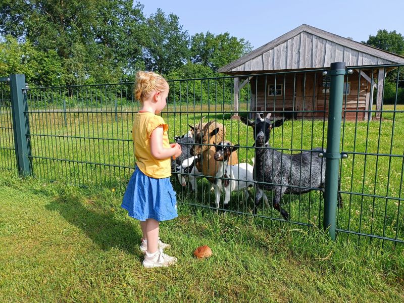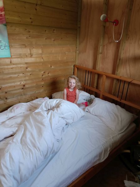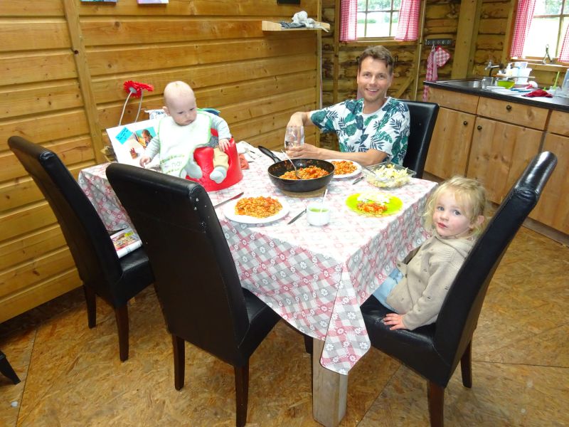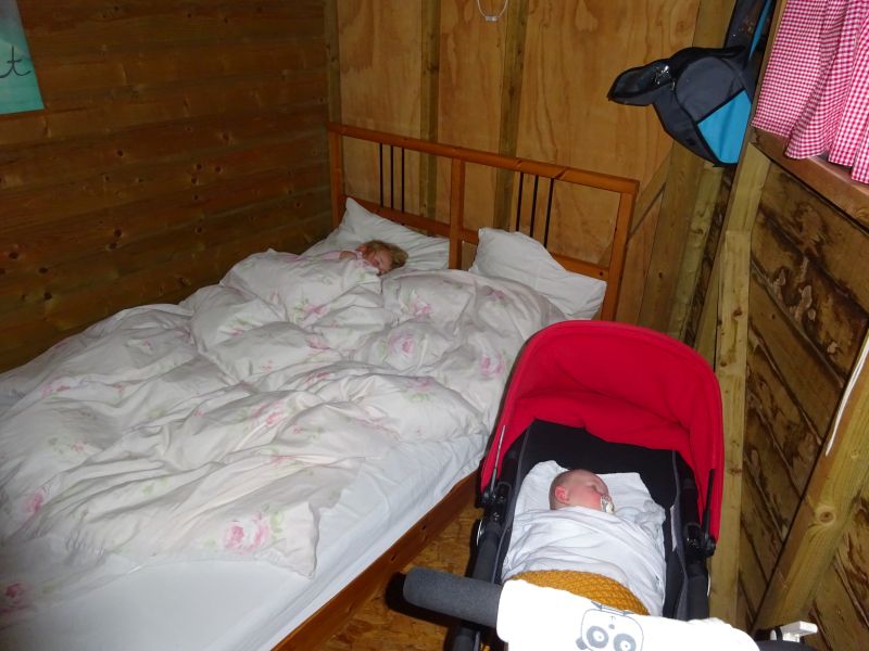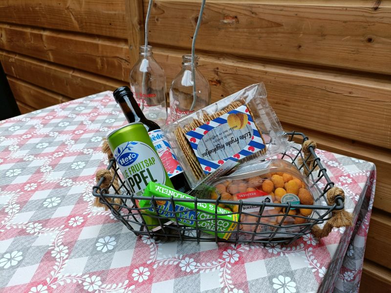 De blokhut staat schitterend achterop de camping met vrij uitzocht over de weilanden. De koeien lopen bij wijze van spreken voor de deur. Snel de auto uitgepakt. Geen regen voor de verandering maar heerlijk zomers weer. In de blokhut stond ook nog een leuk presentje klaar. Chocolade, nootjes, wijn en kniepertjes. Die zijn uiteraard wel opgegaan. Het spelen kon beginnen. Naud lekker in de campingbox en Lianne lekker richting de speeltuin en geitjes.